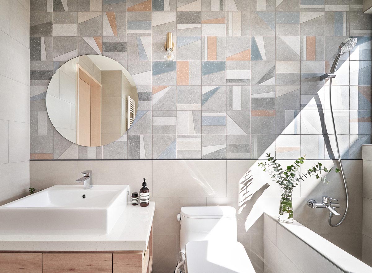 자칫 가벼워 보일 수 있는 인테리어 분위기를 무게감 있는 소재(타일, 대리석)로 벽면을 장식하고