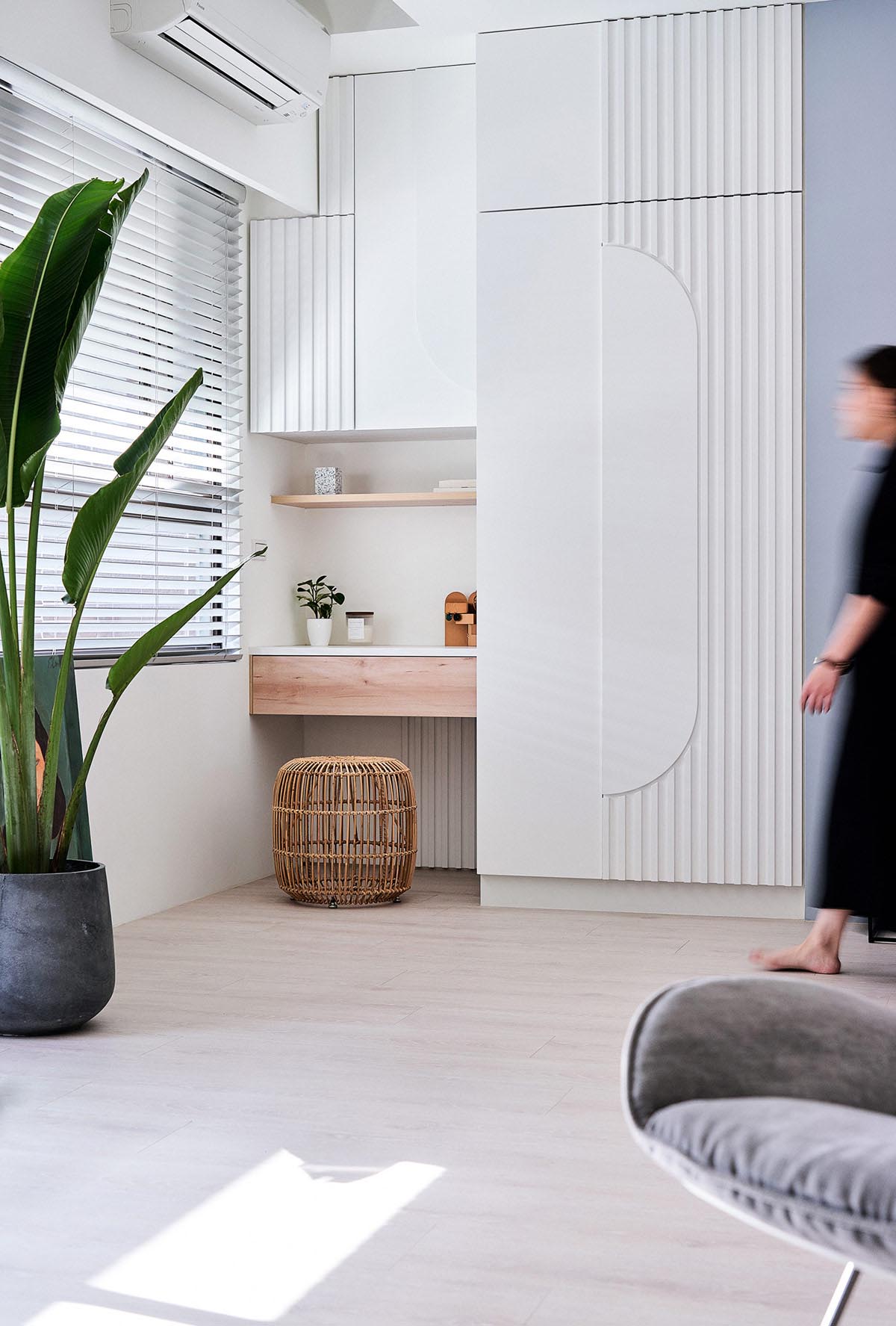 기둥 주위를 둘러싼 흰색의 볼륨은 찬장으로 쓰입니다.