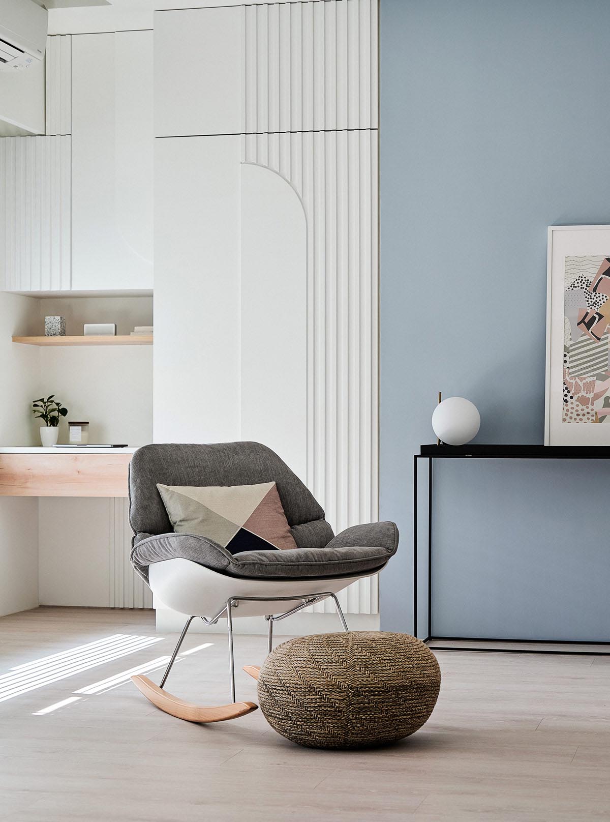 모던한 디자인의 흔들의자와 대비되는 오토만의 등나무 텍스쳐와