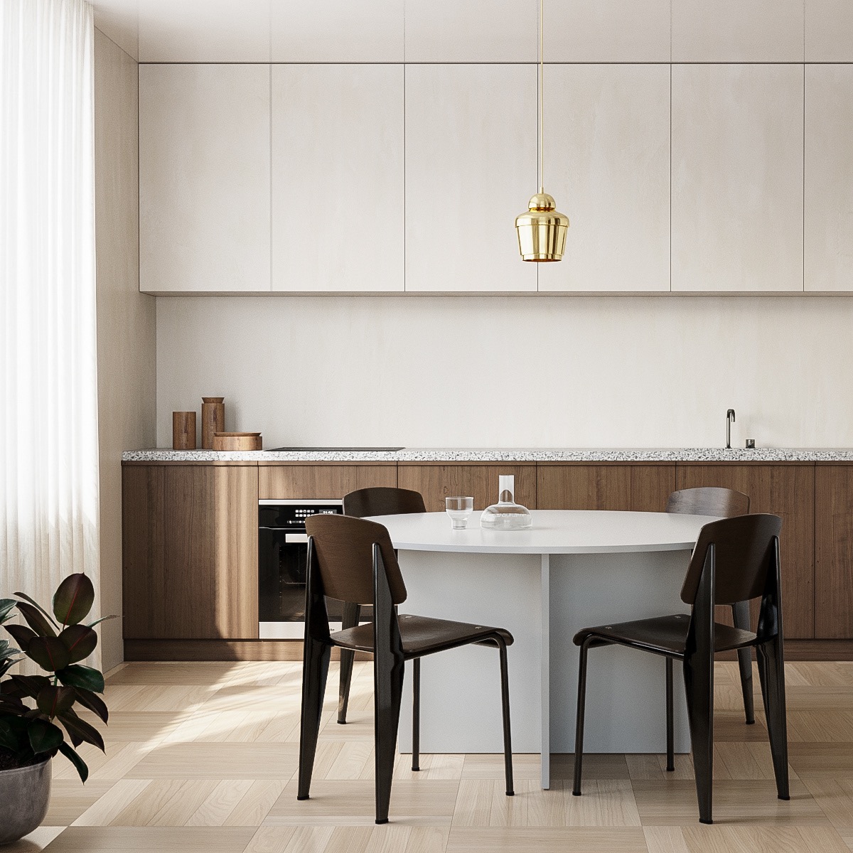 주방에는 흰색의 원형 테이블과 대비되는 짙은 컬러의 스텐다드 체어