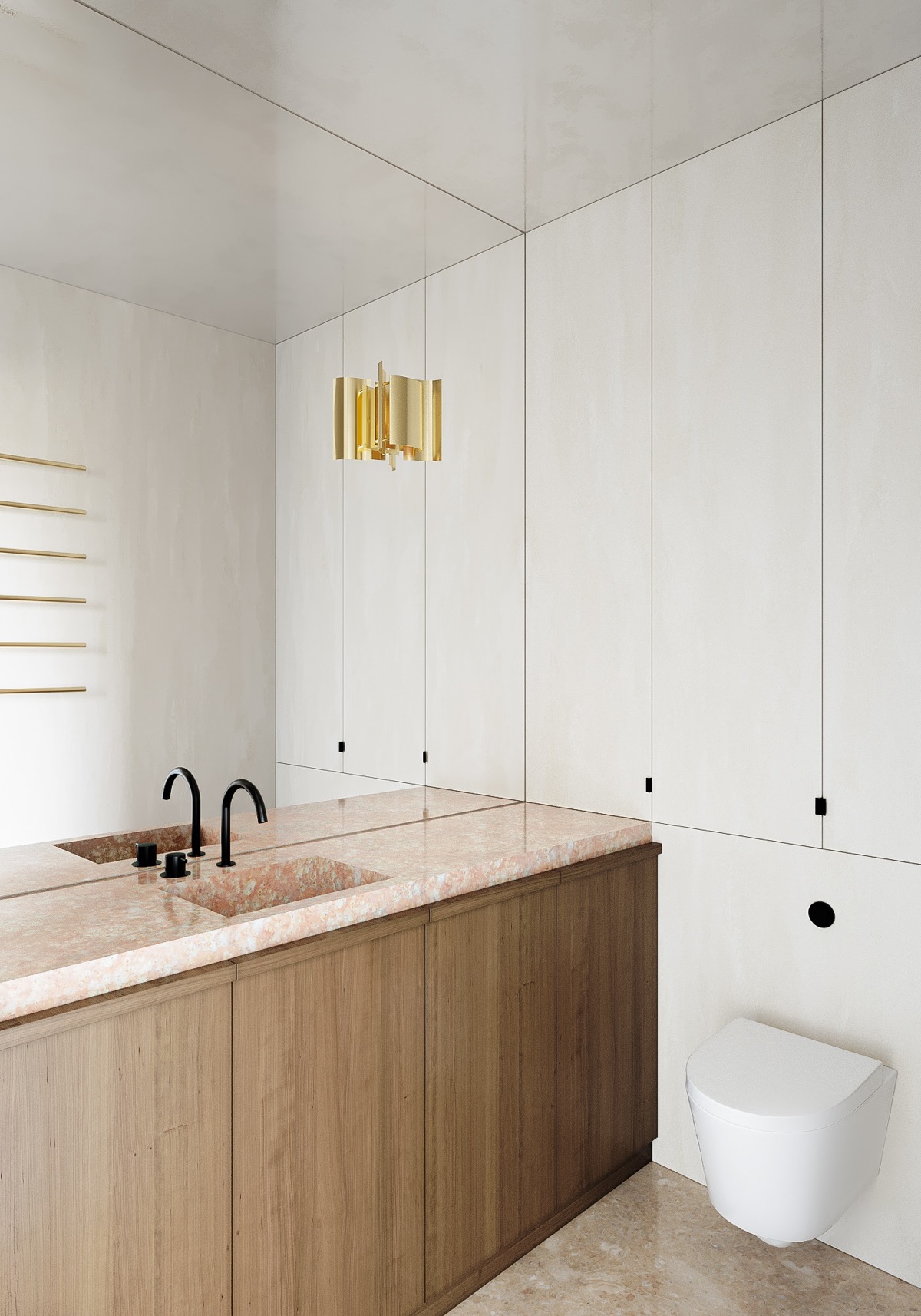 벽면은 무늬유리와 블랙 프레임, 베니어와 각진 대리석 세면대